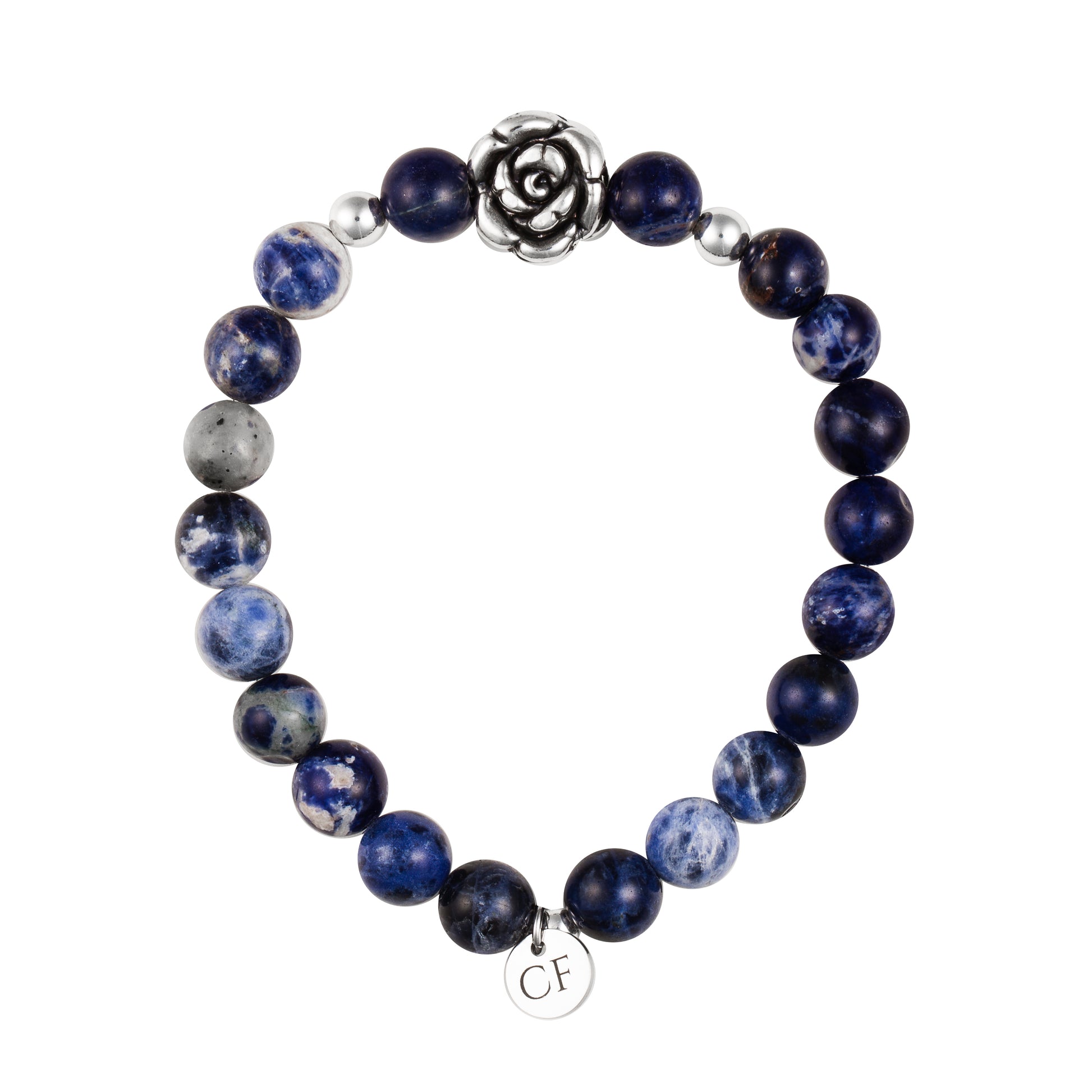 Stretch bracelet with semi-precious stones, sterling silver rose bead, Swarovski crystal